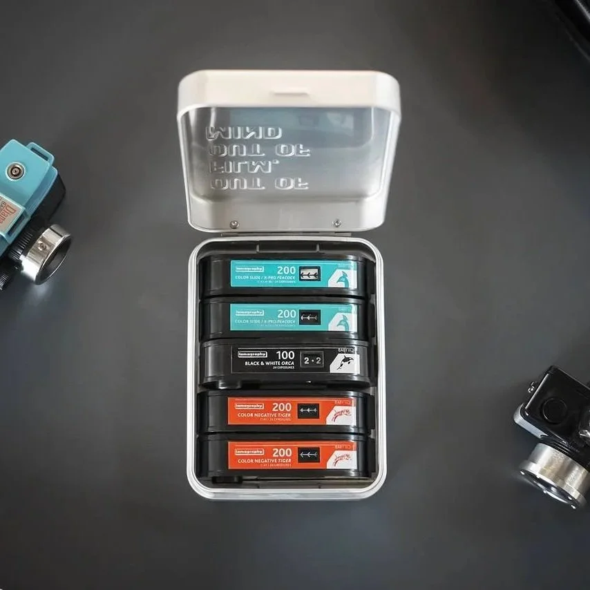 Vous en avez marre des pellicules qui se baladent au fond de votre sac ? De ne pas savoir comment les transporter lorsque vous partez en voyage ? Cette boîte de transport de films Lomography vous permet d’emporter à votre guise :